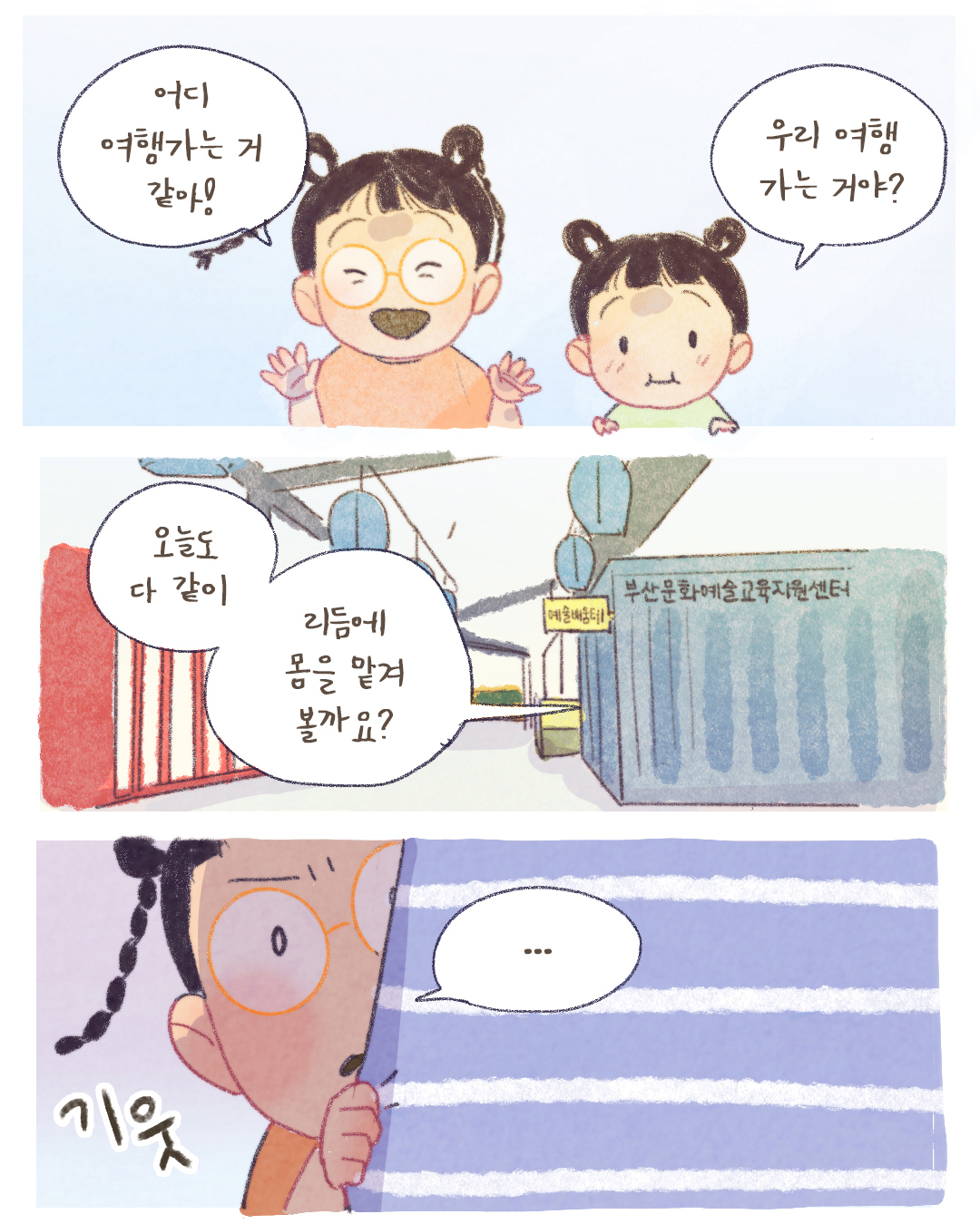 기타자료 기타자료 상셍보기 기타자료 상세페이지 입니다. 제목 부산문화예술교육지원센터 기반구축 홍보 -유아 기획사업 [몽야 예능단] 인스타툰 2화 작성자 관리자 등록일 2025-10-17 16:03:32 조회수 99 부산문화예술교육지원센터- 유아 문화예술교육 지원사업- [몽야 예능단] 나, 너, 우리!(2화 - 봄이의 일기) ※ 본 웹툰은 부산문화예술교육지원센터 사업에 자발적으로 참여한 일반시민의 이야기를 담은 시각 콘텐츠입니다. 목록 이전글 부산문화예술교육지원센터 기반구축 홍보 - 거점 공간 [손이 들려주는 이야기들] 인스타툰 다음글 부산문화예술교육지원센터 기반구축 홍보-유아 기획사업 [몽야 예능단] 인스타툰 1화