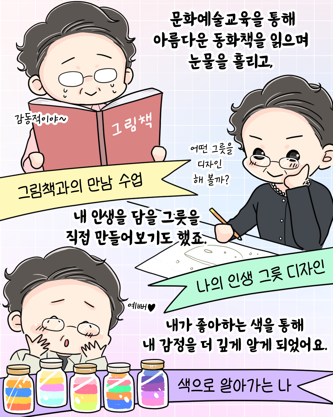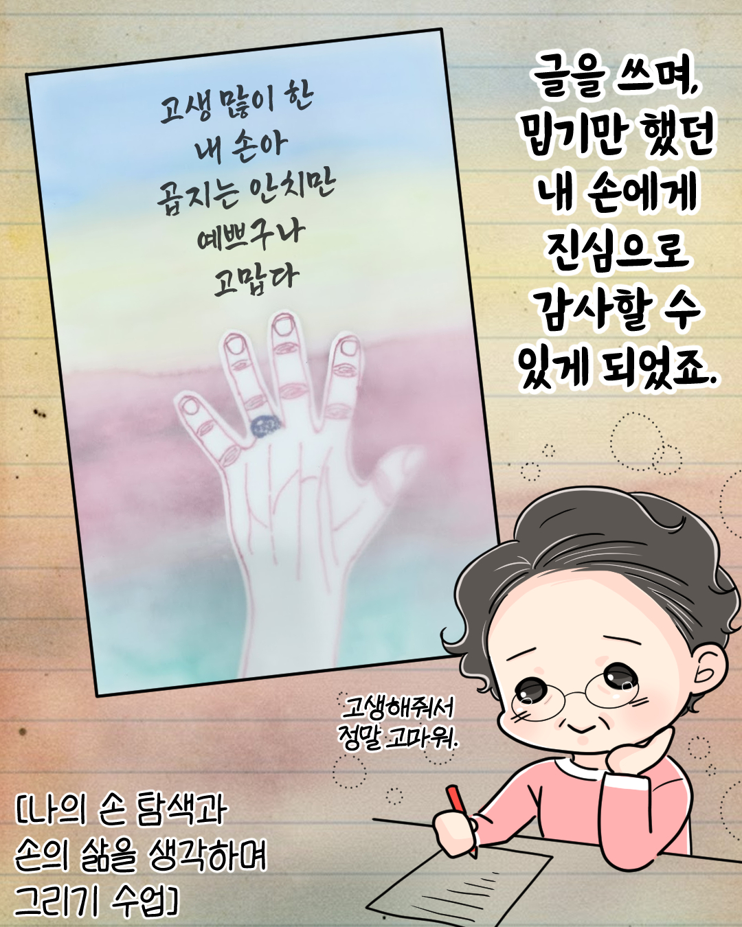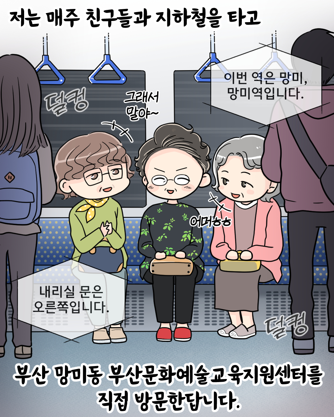 기타자료 기타자료 상셍보기 기타자료 상세페이지 입니다. 제목 부산문화예술교육지원센터 기반구축 홍보 - 거점 공간 [손이 들려주는 이야기들] 인스타툰 작성자 관리자 등록일 2025-10-22 14:13:51 조회수 25 부산문화예술교육지원센터- 거점 공간 기획 프로그램 - [손이 들려주는 이야기들] 손이 들려주는 이야기- 윤양희 할머니와 함께 - ※ 본 웹툰은 부산문화예술교육지원센터 사업에 자발적으로 참여한 일반시민의 이야기를 담은 시각 콘텐츠입니다. 목록 이전글 이전 게시물이 없습니다. 다음글 부산문화예술교육지원센터 기반구축 홍보 -유아 기획사업 [몽야 예능단] 인스타툰 2화