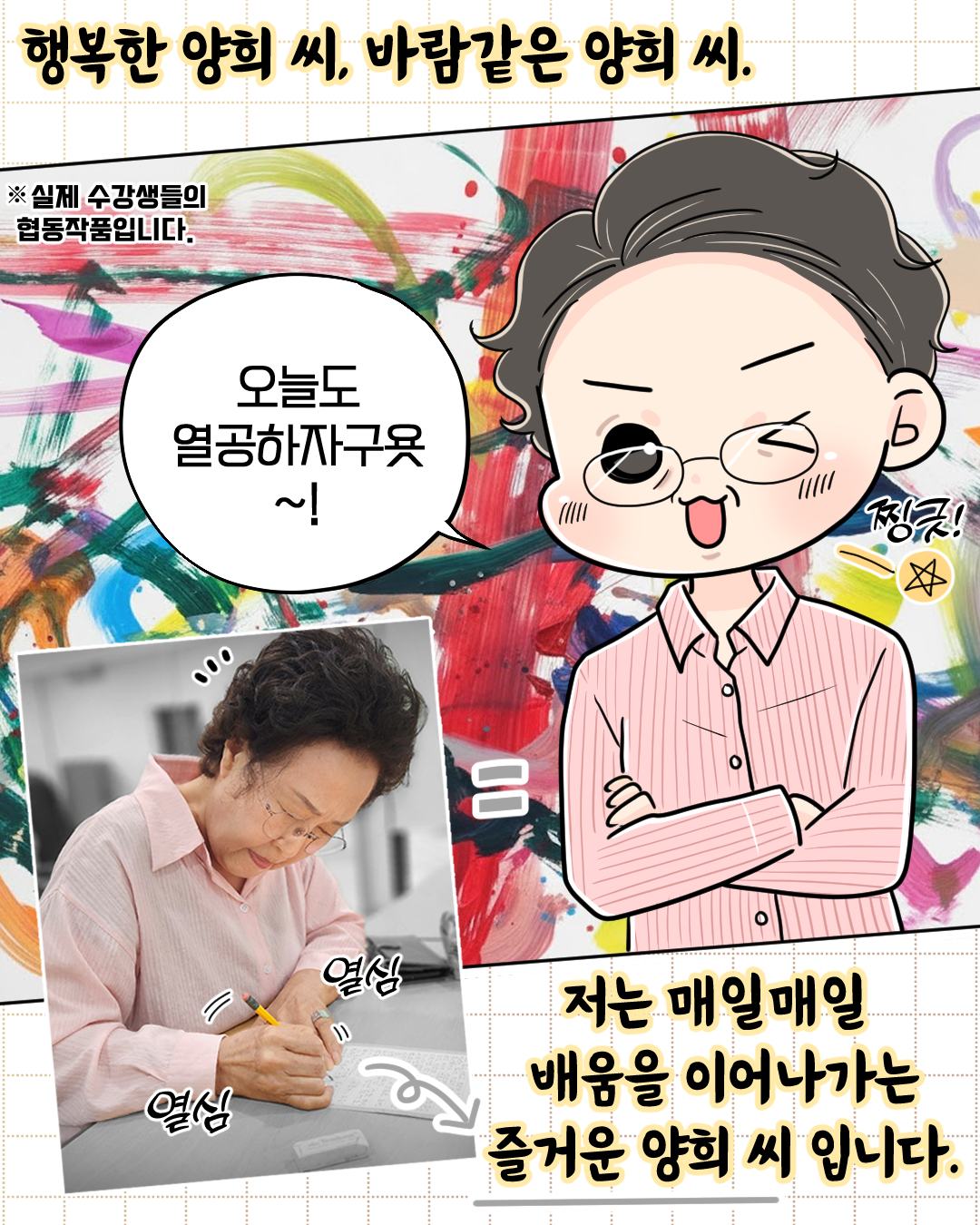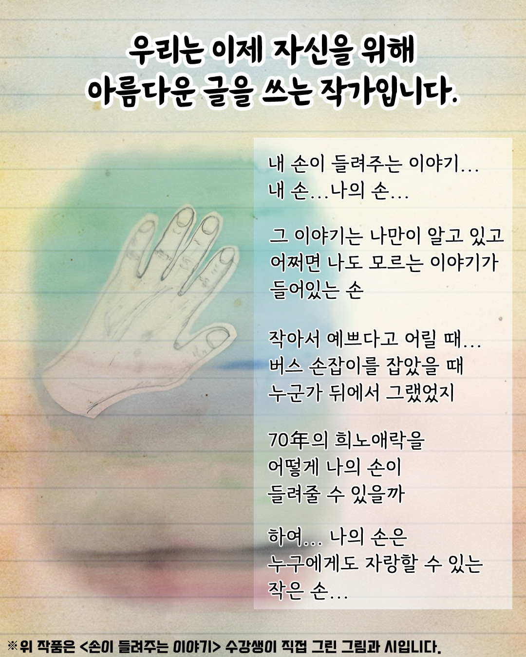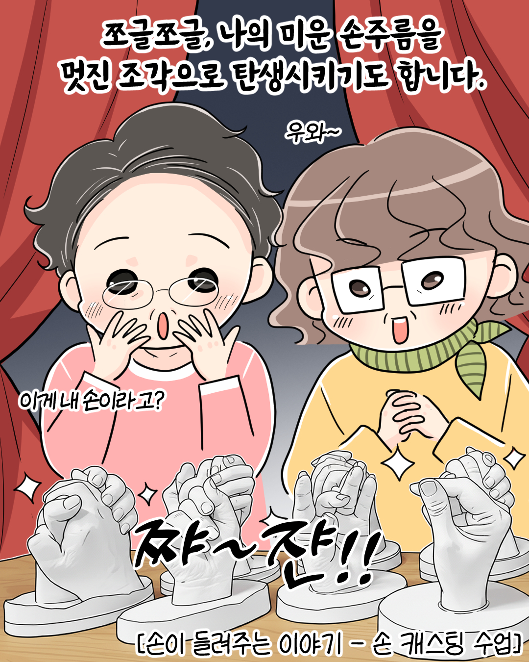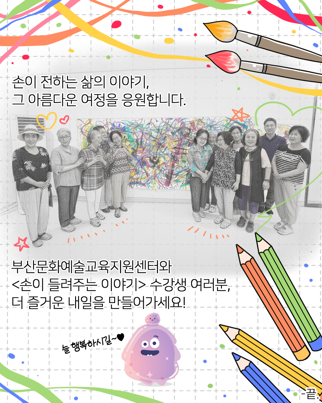 기타자료 기타자료 상셍보기 기타자료 상세페이지 입니다. 제목 부산문화예술교육지원센터 기반구축 홍보 - 거점 공간 [손이 들려주는 이야기들] 인스타툰 작성자 관리자 등록일 2025-10-22 14:13:51 조회수 25 부산문화예술교육지원센터- 거점 공간 기획 프로그램 - [손이 들려주는 이야기들] 손이 들려주는 이야기- 윤양희 할머니와 함께 - ※ 본 웹툰은 부산문화예술교육지원센터 사업에 자발적으로 참여한 일반시민의 이야기를 담은 시각 콘텐츠입니다. 목록 이전글 이전 게시물이 없습니다. 다음글 부산문화예술교육지원센터 기반구축 홍보 -유아 기획사업 [몽야 예능단] 인스타툰 2화