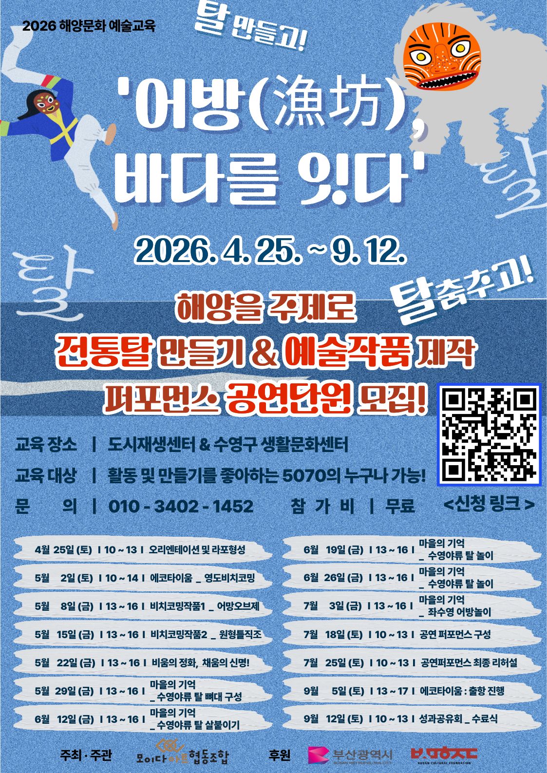 활동 및 만들기를 좋아하는 5070의 성인 누구나 가능하며 함께 비치코밍 / 탈만들기 / 공연준비 / 실제 공연진행 등 다양한 활동을 통해 단절된 세대를 해양예술이라는 공통언어로 연결합니다.