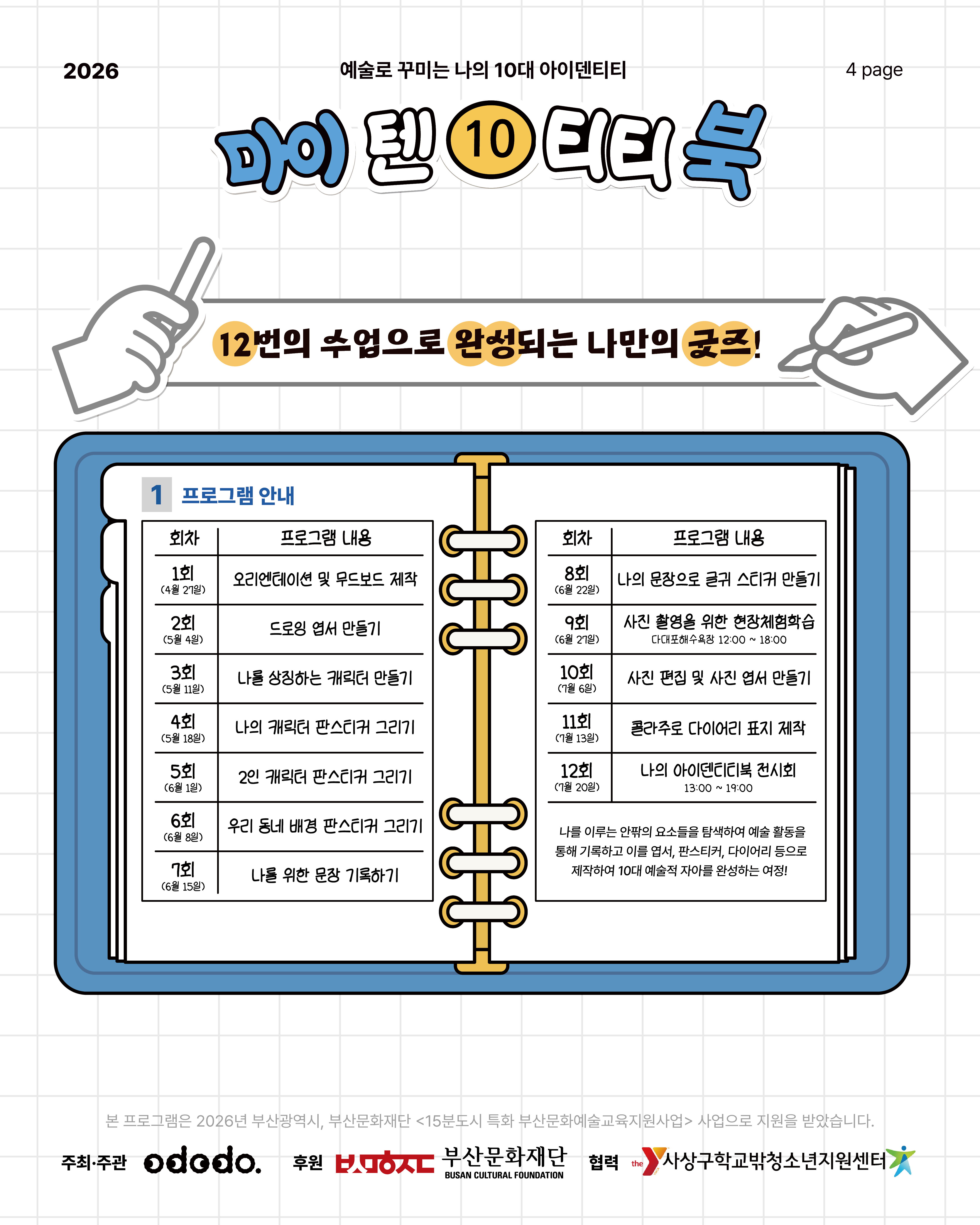 [마이 텐(10)티티북 : 예술로 기록하는 나의 10대]는 손작업부터 아이패드 드로잉까지, 12번의 수업으로 모두 경험할 수 있습니다!
