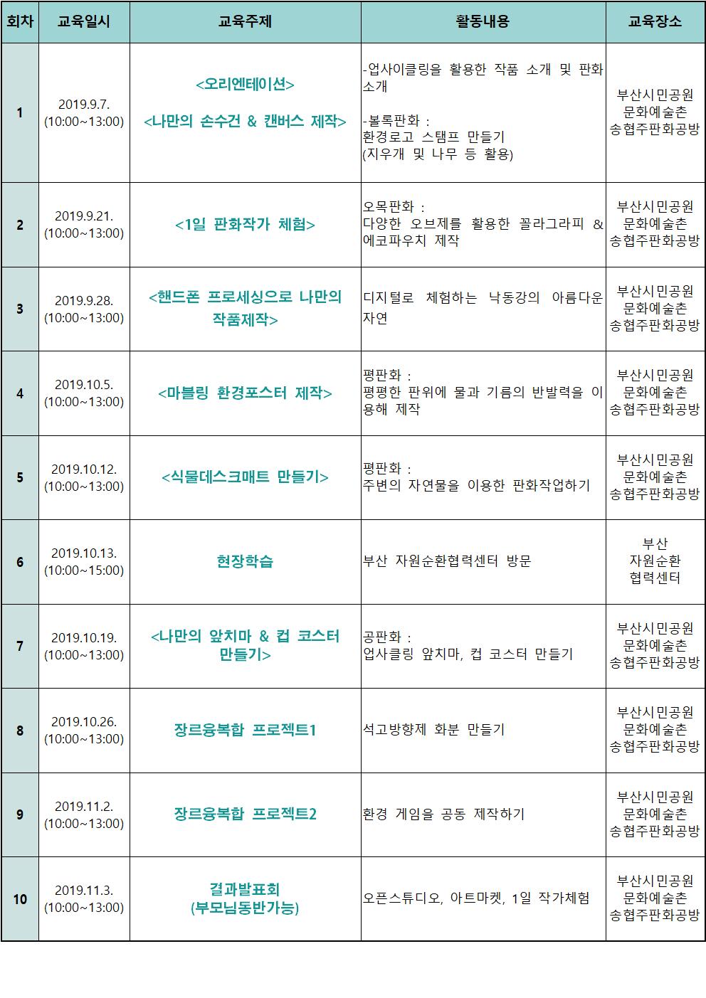 | 교육일자 | 2019-09-07(토) ~ 2019-11-03(일) (1회당 교육시간 : 3시간 | ||