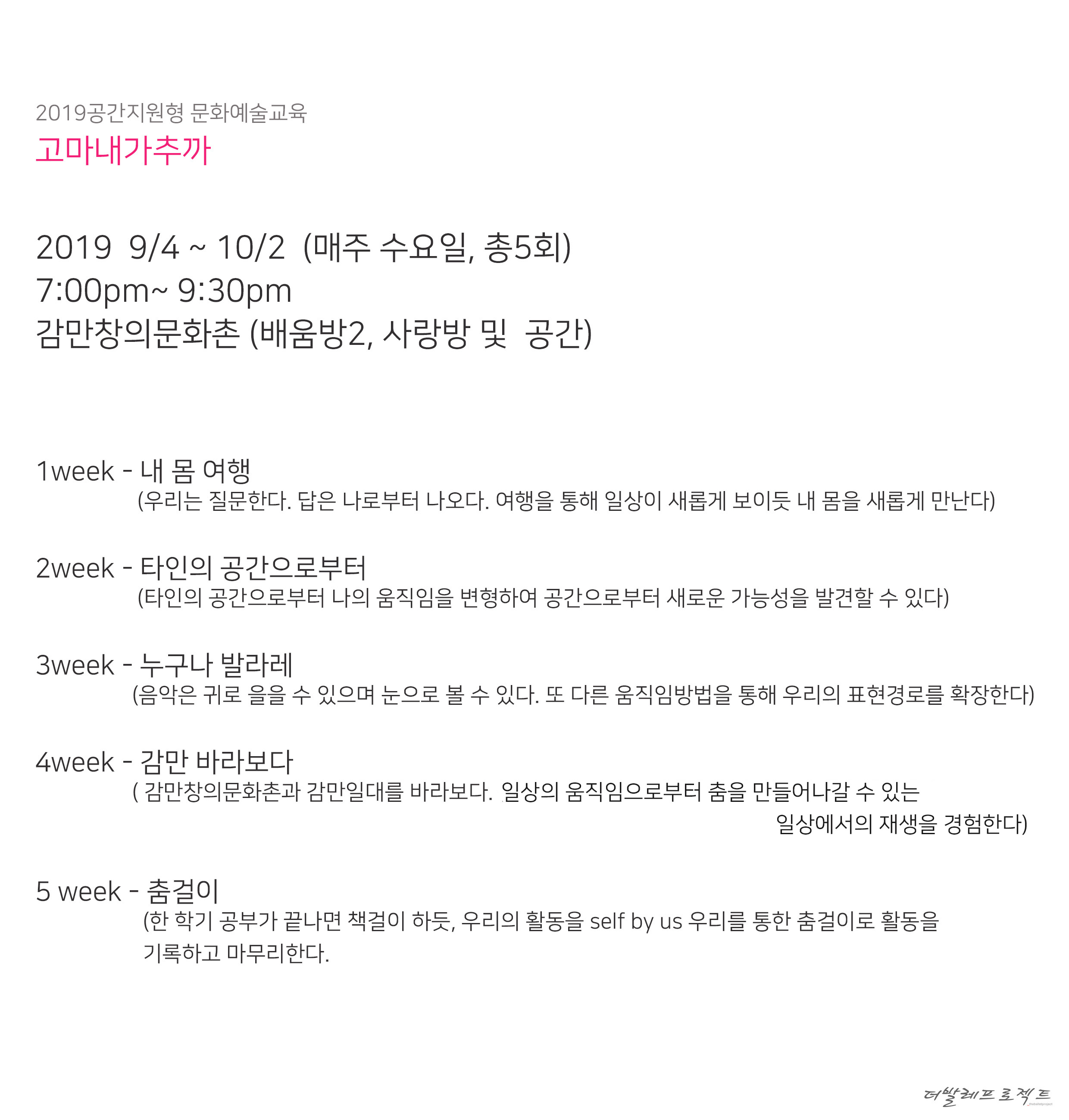 또한, 감만창의문화촌이라는 공간속에서 몸과 움직임으로부터 나를 표현하는 다양성과 더불어 예술에 한걸음 더 다가가는 활동이 될것입니다. 환영합니다 ^ ^