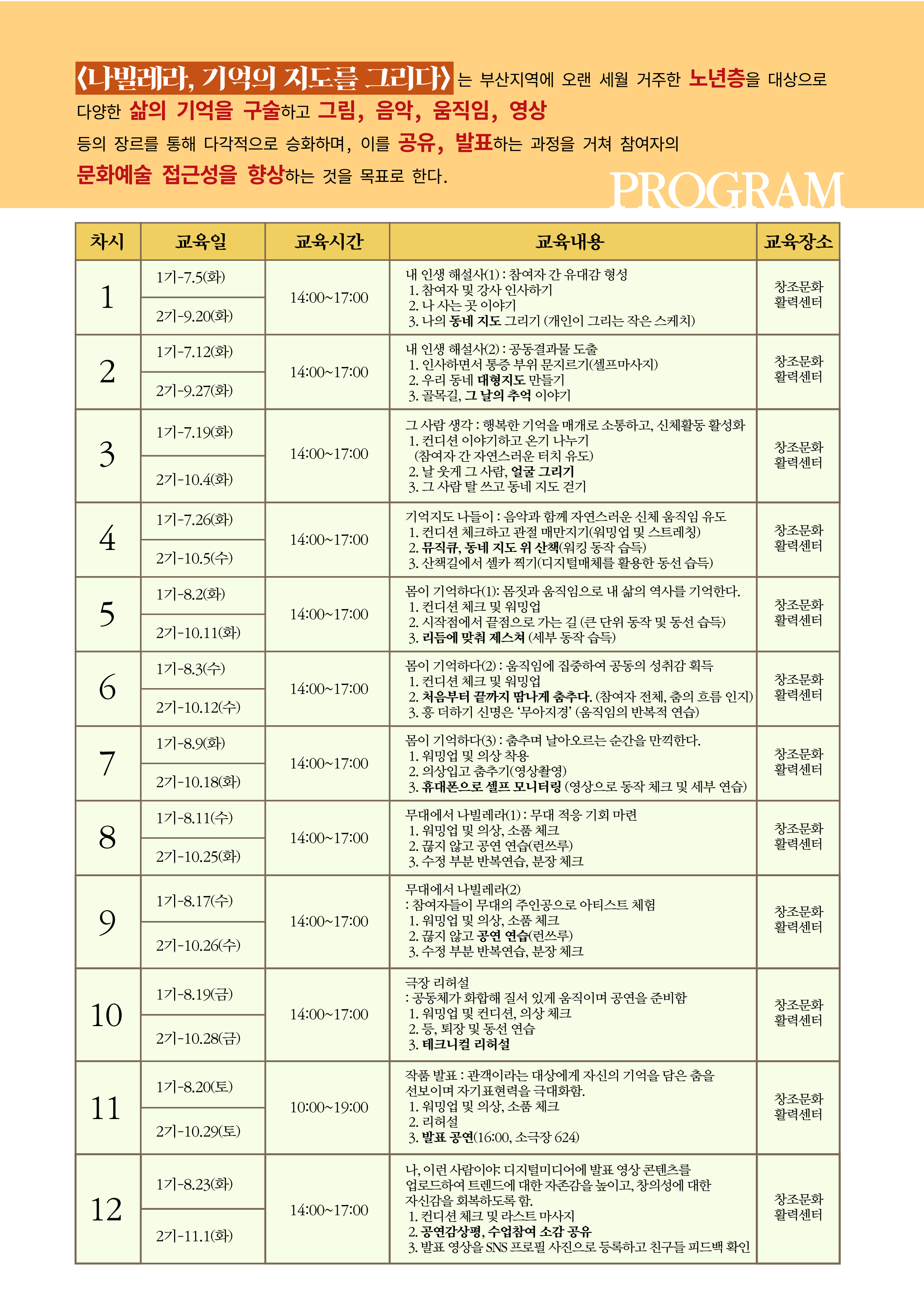 <나빌레라, 기억의 지도를 그리다>는 부산지역에 오랜 세월 거주한 노년층을 대상으로 다양한 삶의 기억을 구술하고 그림, 음악, 움직임, 영상 등의 장르를 통해 다각적으로 승화하며, 이를 공유, 발표하는 과정을 거쳐 참여자의 문화예술 접근성을 향상하는 것을 목표로 한다.