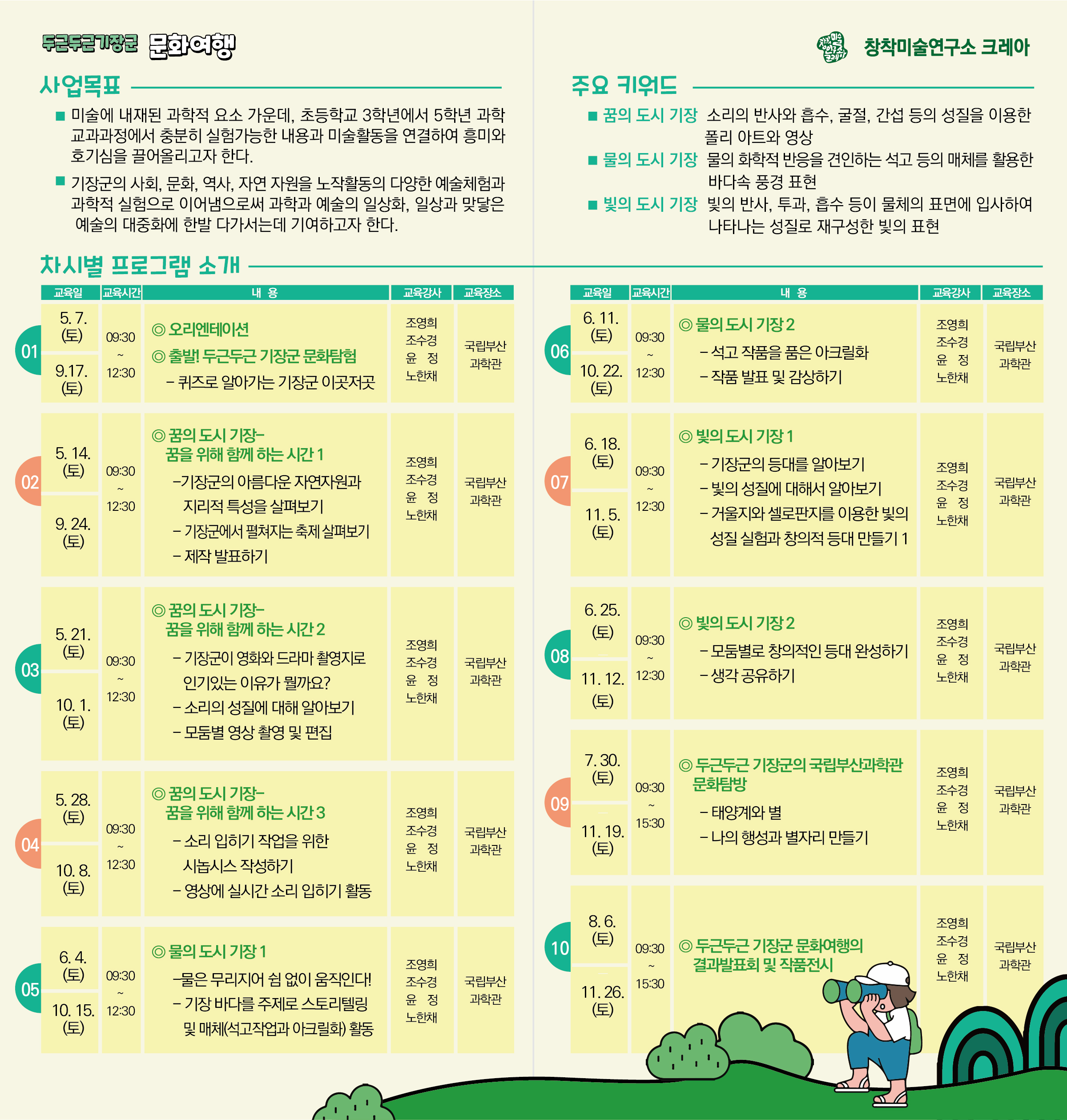 <두근두근 기장군 문화여행>은 기장군 거주 아동청소년들과 함께 기장군의 역사, 문화, 예술, 생태 자원 환경을 찾아 조사하고 미술에 내재된 과학적 요소를 발견하며, 다양한 예술적 표현 활동으로 실험과 체험이 가능하도록 구성된 프로그램입니다. 창작미술연구소 크레아는 2022 꿈다락문화학교 <두근두근 기장군 문화여행>을 통하여 아이들의 자긍심 향상, 융합적 사고와 창의적 상상력 자극을 일깨워주고자 합니다.