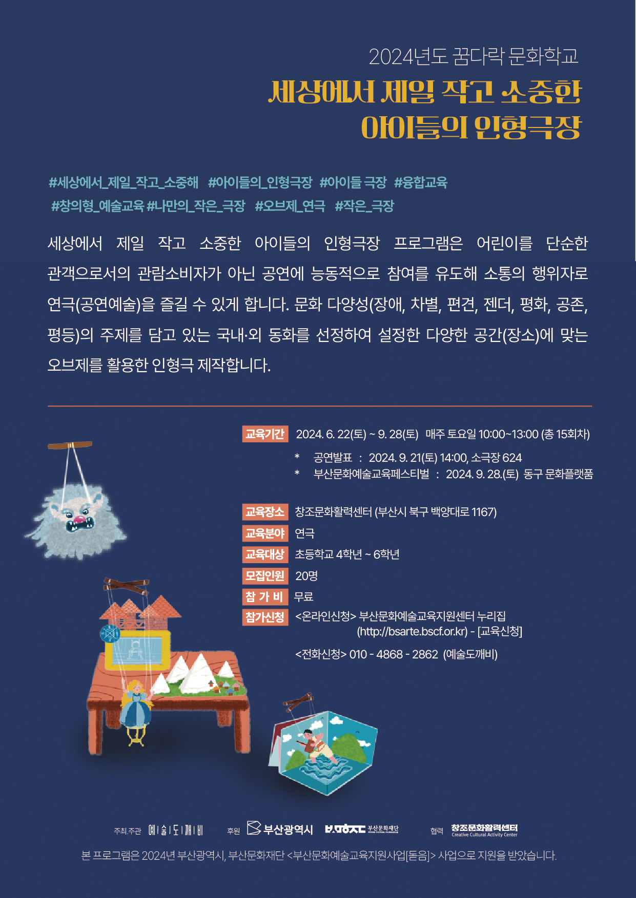 세상에서 제일 작고 소중한 아이들의 인형극장 프로그램은 어린이를 단순한 관객으로서의 관람소비자가 아닌 공연에 능동적으로 참여를 유도해 소통의 행위자로 연극(공연예술)을 즐길 수 있게 합니다. 문화 다양성(장애, 차별, 편견, 젠더, 평화, 공존, 평등)의 주제를 담고 있는 국내·외 동화를 선정하여 설정한 다양한 공간(장소)에 맞는 오브제를 활용한 인형극을 제작합니다.