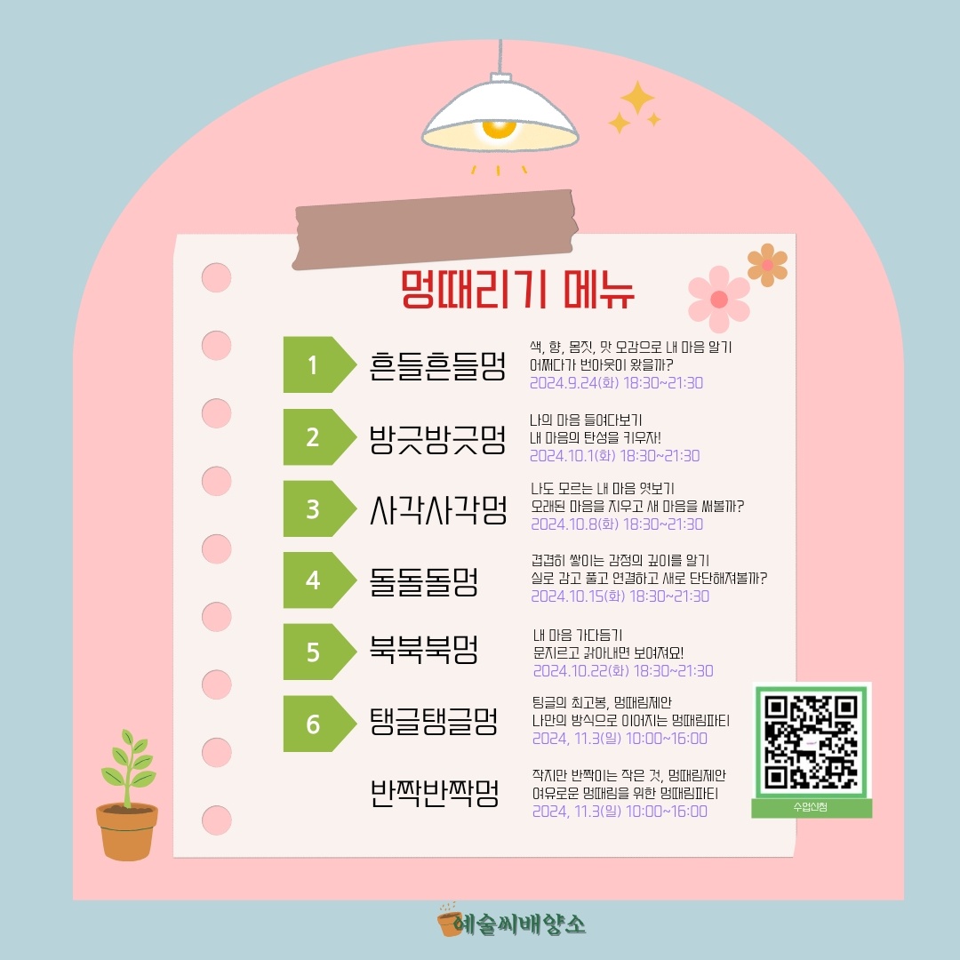 총 6회차로 진행되며 한 회도 빠짐없이 참여할 수 있는, 적극적으로 멍때릴 분들의 많은 참여 바랍니다.