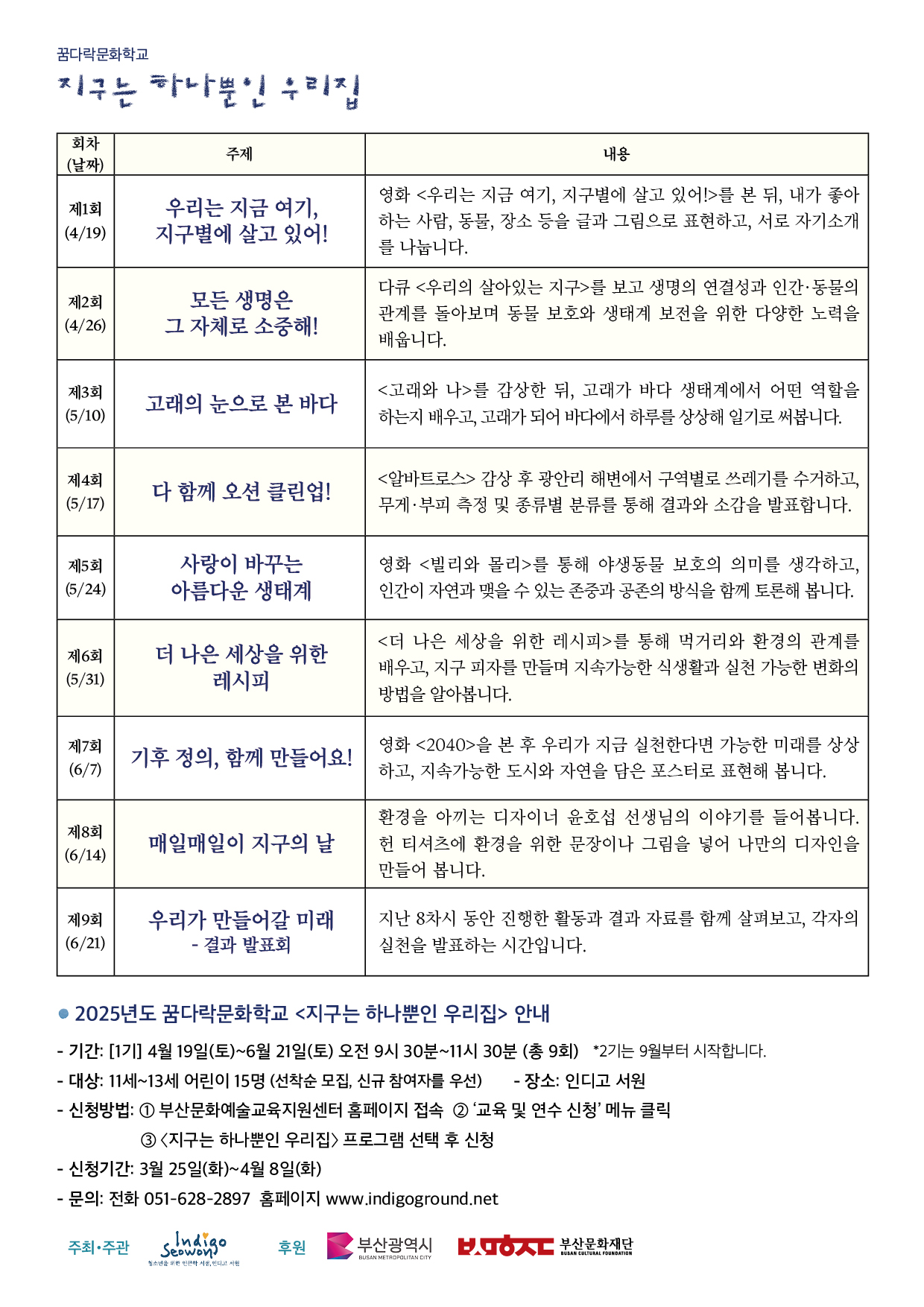 | 교육일자 | 2025-04-19(토) ~ 2025-06-21(토) (1회당 교육시간 : 2시간 | ||
