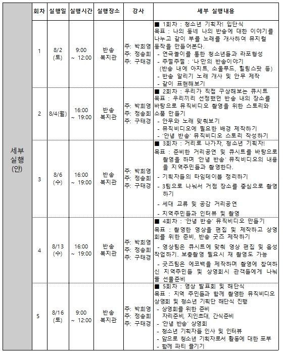 반송을 살아가는 아동과 청소년들이 지역주민들과 함께 연극,미술,영상 다양한 장르의 융합으로 하나의 축제를 기획하고 실행하는 프로그램 입니다.